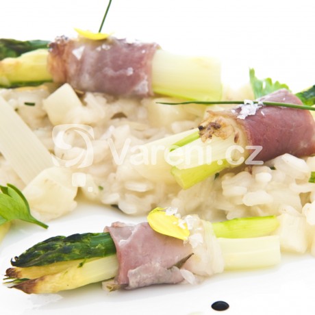 Chřest pošírovaný v máslové emulzi s tyrolským špekem na rizotu z bílého chřestu