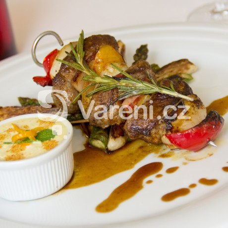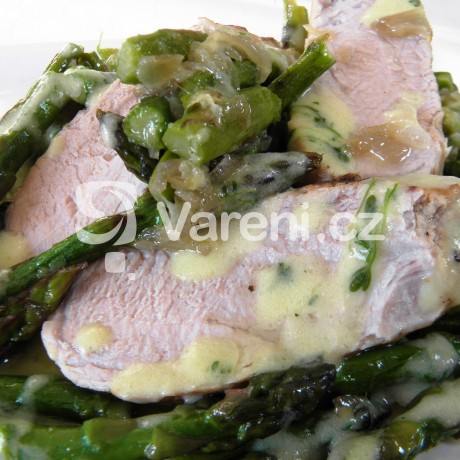 Rib eye steak s chřestem, holandskou omáčkou a pečeným bramborem
