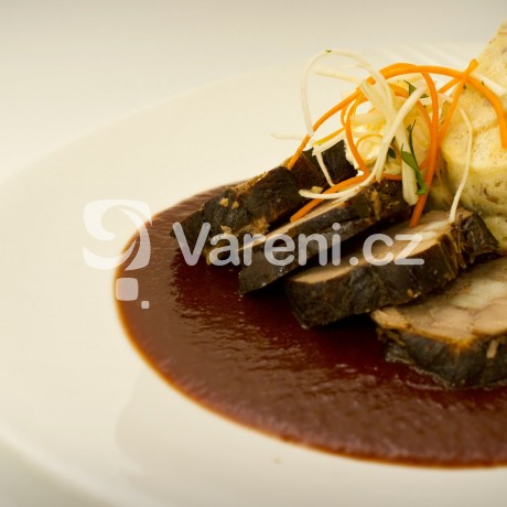 Špikovaná kančí kýta se šípkovou omáčkou a perníkovým knedlíkem