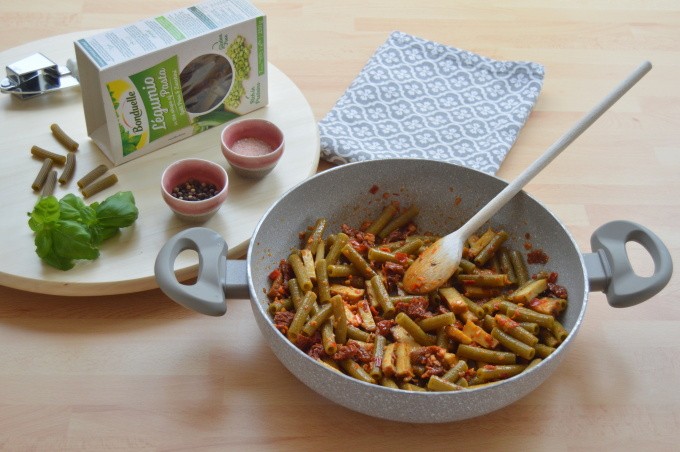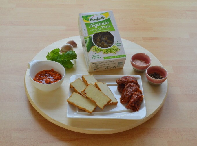 Na 2 porce budeme potřebovat 250 g luštěninových těstovin Bonduelle Légumio rigatoni z hrachu a cukety, 100 g sušených rajčat, 200 g uzeného tofu, 50 - 60 g pesto omáčky, pro dochucení česnek, sůl a pepř.