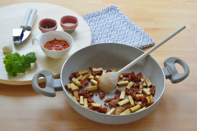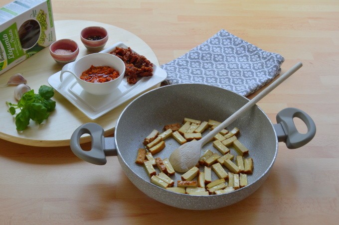 2) Na pánvi rozehřejeme lžíci oleje ze sušených rajčat, přídáme na hranolky nakrájené tofu a pár minut restujeme, až je zlatavé.