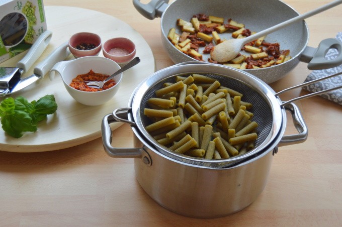 4) Luštěninové těstoviny uvaříme v osolené vodě al dente, což trvá zhruba 7 minut. Uvařené těstoviny slijeme a propláchneme studenou vodou.