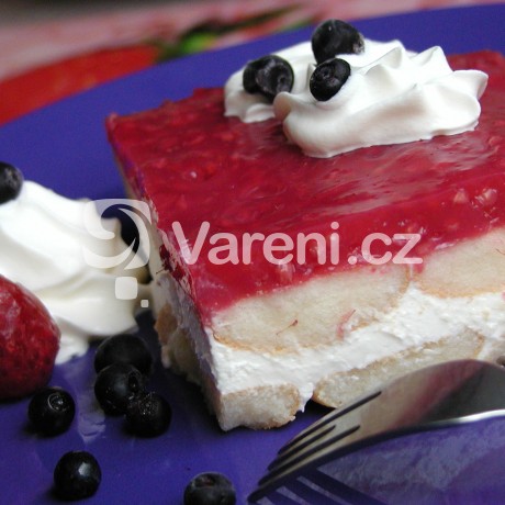Z očištěných malin vymačkáme 300ml šťávy, přisypeme vanilkový cukr a balíček ovocného želé. Za stálého míchání želatinu na sporáku rozpustíme. Nevaříme!. Do teplého želé přidáme šťávu z limetky, 4 lžíce sherry a 100g celých, mírně rozmačkaných malin. Směs promícháme a necháme stát – ne však zcela ztuhnout! Jogurt (250g) smícháme se 100g cukru moučky, přidáme šťávu a kůru z limetky a v trošce vody rozpuštěnou lžičku želatiny. Nakonec do krému vmícháme tuhou šlehačku (1/2 kelímku). Červené malinové želé střídavě s limetkovým krémem nanášíme do pohárů. Dezert uložíme do chladničky a necháme dobže zatuhnout. Poháry před podáváním ozdobíme kopečkem šlehačky a několika kuličkami malin.