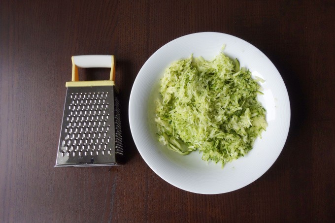 2) Nejprve si najemno nastrouháme cuketu. Pokud je mladá, neloupeme ji, ani nevyndáváme semínka. Celkem by jí měl být cca jeden napěchovaný hrnek. Vodu z cukety nevyléváme, použijeme ji také do těsta.