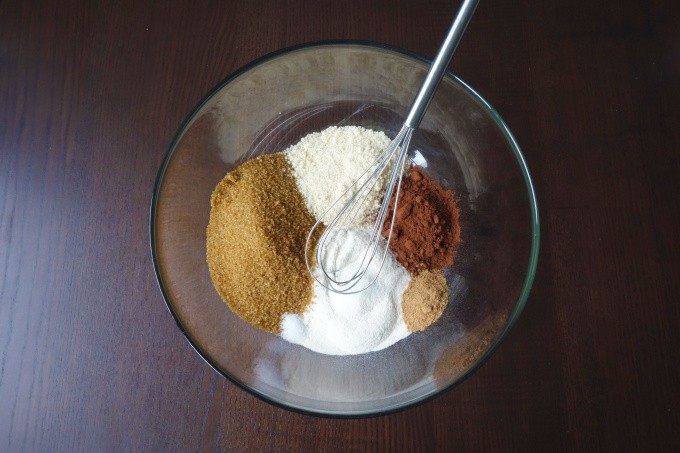 3) Do mísy si odměříme všechny sypké suroviny, tedy mouku, mleté ořechy, třtinový cukr, kakao, kypřicí prášek, špetku soli a perníkové koření. Důkladně promícháme vidličkou či metličkou.