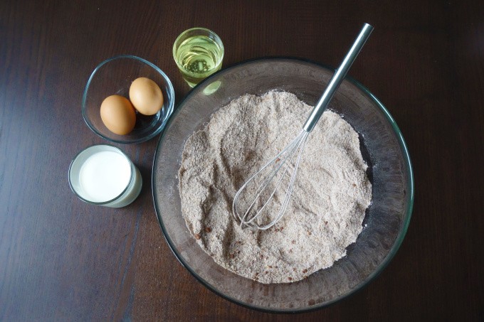 4) Po rozmíchání přidáme do směsi celá vejce, mléko, olej a opět metličkou rozmícháme tak, aby v těstě nebyly žádné hrudky.