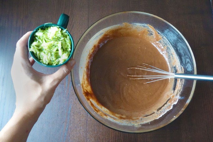 5) Po důkladném rozmíchání přidáme i najemno nastrouhanou cuketu, včetně vody, kterou pustila. Pokud by bylo těsto příliš husté, naředíme trochou mléka.