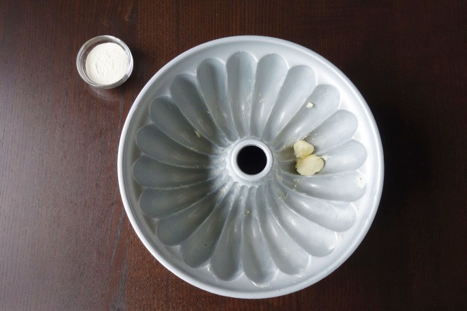 6) Předehřejeme si troubu na 175 °C a formu na bábovku důkladně vymažeme máslem a vysypeme polohrubou moukou (případně strouhankou či mletými ořechy).