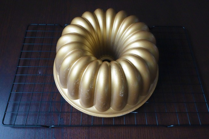 9) Po cca 5 minutách vytažení bábovky z trouby ji přiklopíme mřížkou, případně talířem s ubrouskem a přetočíme tak, aby se bábovka dala vyklopit.