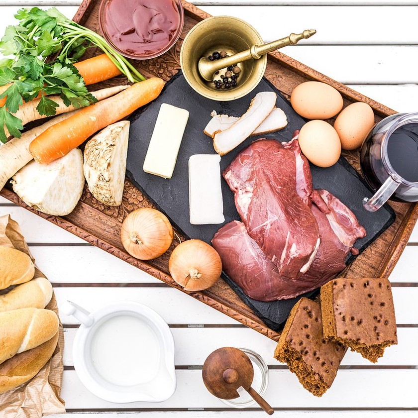 Na omáčku: 800 g jelení kýty, 50 g uzeného špeku, 50 g sádla, 2 cibule, 2 mrkve, 2 kořenové petržele, ¼ bulvy celeru, 150 ml červeného vína, 150 g šípkové zavařeniny, 6 kuliček nového koření, 8 kuliček jalovce, 2 bobkové listy, 12 kuliček pepře, ½ citronu, sůl a pepř.